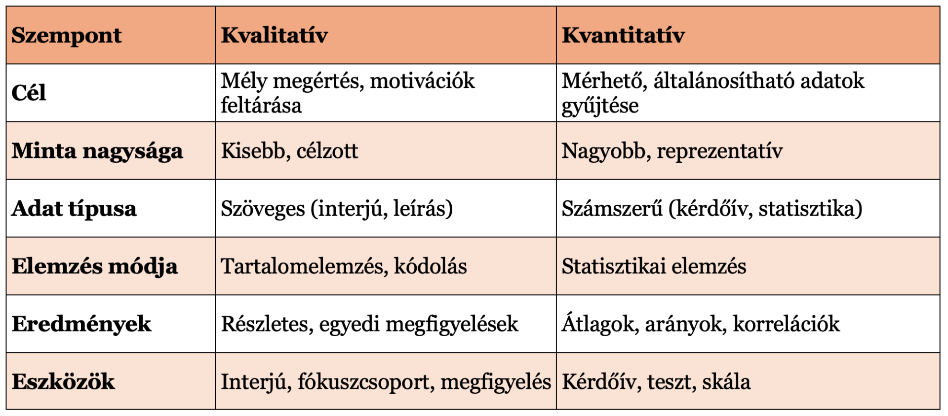 – Ha "Mennyire?" vagy "Hányan?" kérdéseid vannak → kvantitatív.Gondold át a mintát.