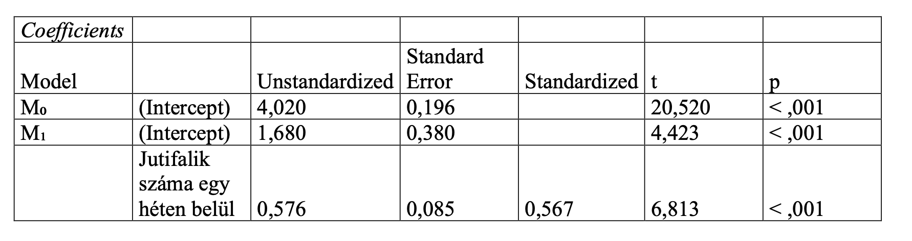 Ha az R2 érték gagyi, pl. 10 százalék alatti, akkor a harmadik táblázatra, azaz a koefficiens táblázatra felesleges tovább menni. Tehát elmondjuk, hogy nagyon gyenge kapcsolat van, a hipotézist nem sikerült igazolni, és kész. De ha ez az érték meghaladja a 0,1-et, azaz a 10%-ot, akkor folytathatjuk az elemzést, és megnézzük a 3. táblázatot is!